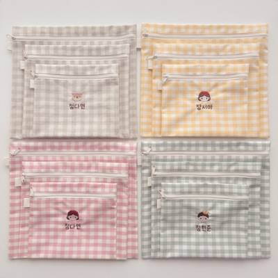 핑크,옐로,민트체크 파우치에비해 두께감이 있습니다.